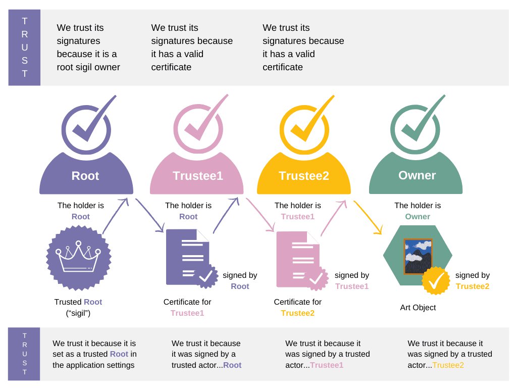 The certificates are tagged. Trust is calculated for each tag separately. The "art" tag is used for the smartefact project's assets records.